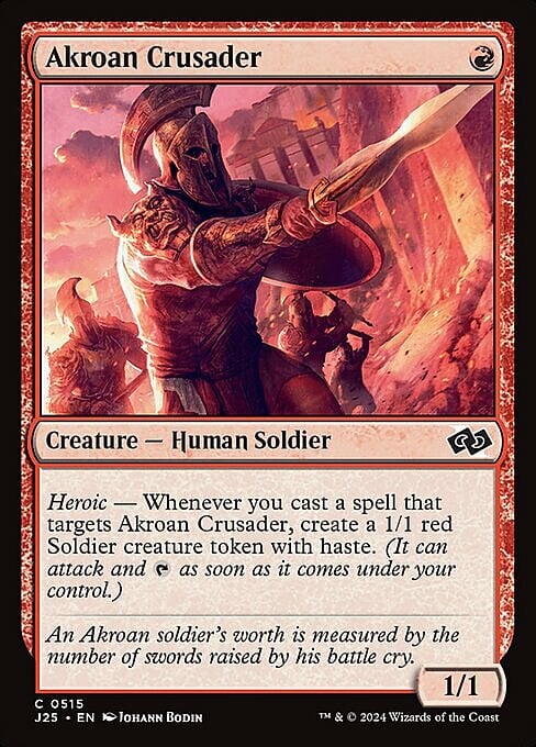 Heroic — Whenever you cast a spell that targets this creature, create a 1/1 red Soldier creature token with haste. (It can attack and {T} as soon as it comes under your control.)