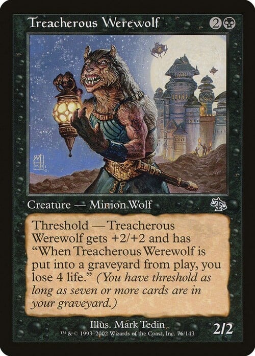 Threshold — As long as seven or more cards are in your graveyard, this creature gets +2/+2 and has "When this creature dies, you lose 4 life."