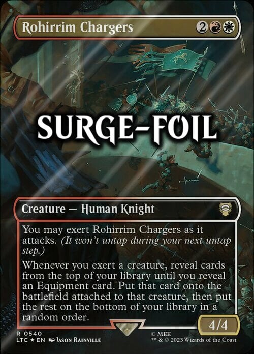 Whenever you exert a creature, reveal cards from the top of your library until you reveal an Equipment card. Put that card onto the battlefield attached to that creature, then put the rest on the bottom of your library in a random order.