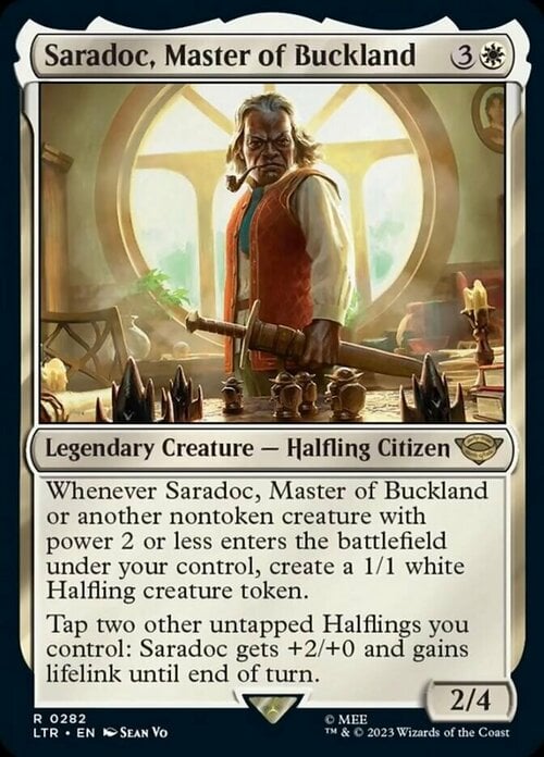 Whenever Saradoc or another nontoken creature you control with power 2 or less enters, create a 1/1 white Halfling creature token.