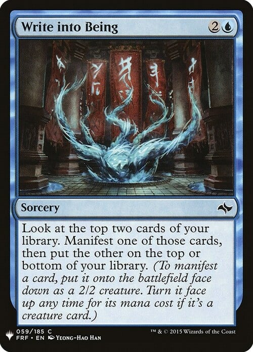 Look at the top two cards of your library. Manifest one of those cards, then put the other on the top or bottom of your library. (To manifest a card, put it onto the battlefield face down as a 2/2 creature. Turn it face up any time for its mana cost if it's a creature card.)