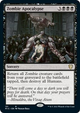Return all Zombie creature cards from your graveyard to the battlefield tapped, then destroy all Humans.