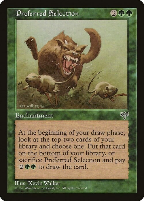 At the beginning of your upkeep, look at the top two cards of your library. You may sacrifice this enchantment and pay {2}{G}{G}. If you do, put one of those cards into your hand. If you don't, put one of those cards on the bottom of your library.