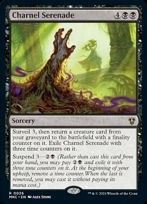 Surveil 3, then return a creature card from your graveyard to the battlefield with a finality counter on it. Exile Charnel Serenade with three time counters on it.