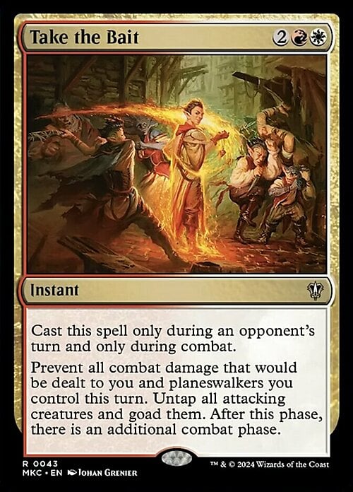 Prevent all combat damage that would be dealt to you and planeswalkers you control this turn. Untap all attacking creatures and goad them. After this phase, there is an additional combat phase.