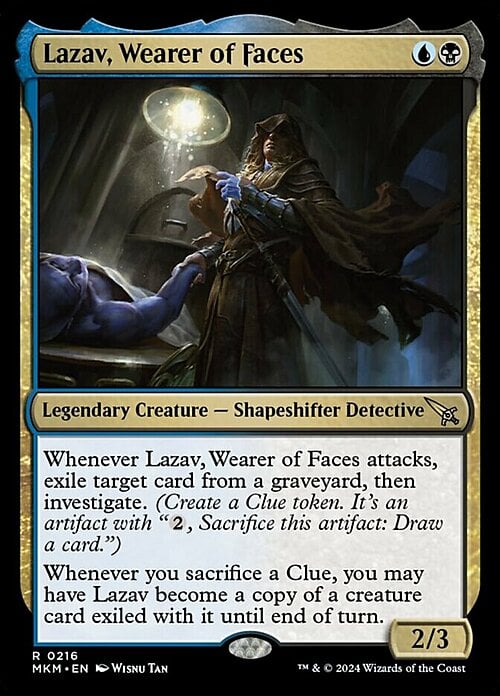 Whenever Lazav attacks, exile target card from a graveyard, then investigate. (Create a Clue token. It's an artifact with "{2}, Sacrifice this token: Draw a card.")