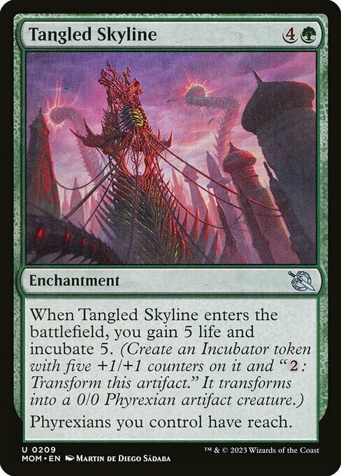 When this enchantment enters, you gain 5 life and incubate 5. (Create an Incubator token with five +1/+1 counters on it and "{2}: Transform this token." It transforms into a 0/0 Phyrexian artifact creature.)