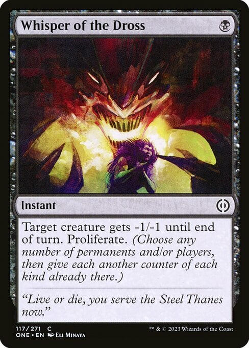 Target creature gets -1/-1 until end of turn. Proliferate. (Choose any number of permanents and/or players, then give each another counter of each kind already there.)