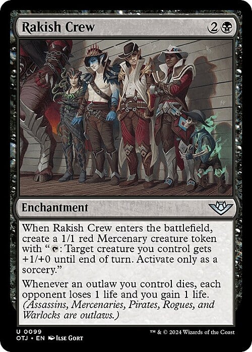 Whenever an outlaw you control dies, each opponent loses 1 life and you gain 1 life. (Assassins, Mercenaries, Pirates, Rogues, and Warlocks are outlaws.)