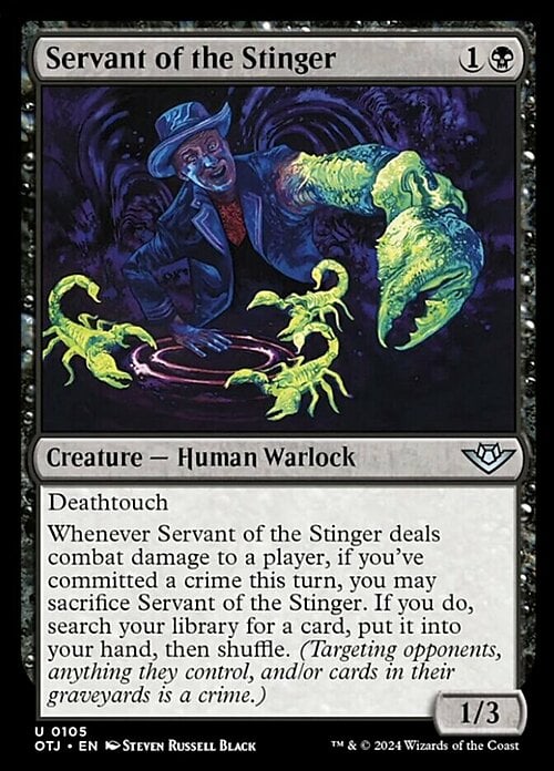 Whenever this creature deals combat damage to a player, if you've committed a crime this turn, you may sacrifice this creature. If you do, search your library for a card, put it into your hand, then shuffle. (Targeting opponents, anything they control, and/or cards in their graveyards is a crime.)