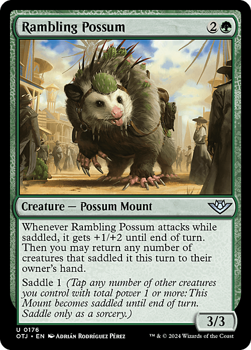 Saddle 1 (Tap any number of other creatures you control with total power 1 or more: This Mount becomes saddled until end of turn. Saddle only as a sorcery.)