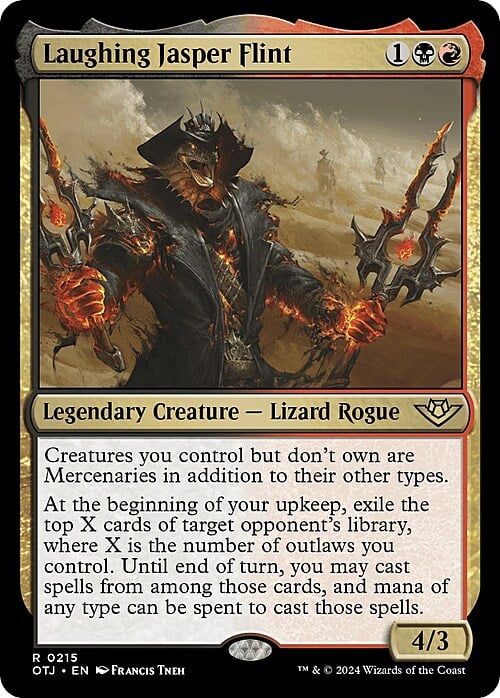 At the beginning of your upkeep, exile the top X cards of target opponent's library, where X is the number of outlaws you control. Until end of turn, you may cast spells from among those cards, and mana of any type can be spent to cast those spells.