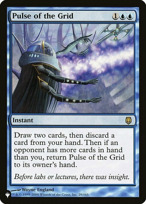 Draw two cards, then discard a card. Then if an opponent has more cards in hand than you, return Pulse of the Grid to its owner's hand.