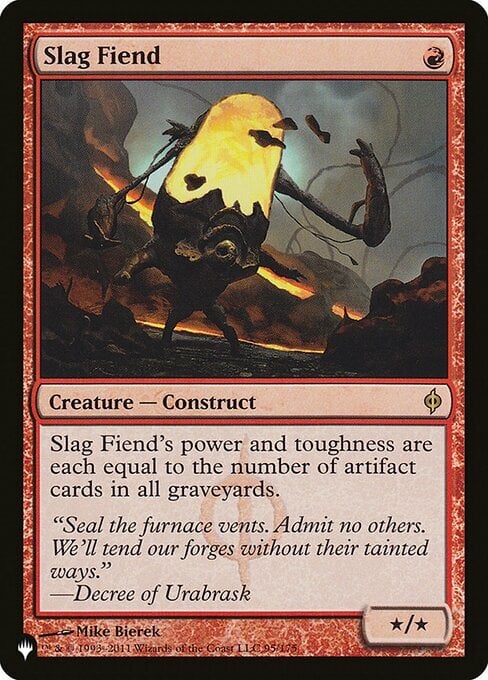 Slag Fiend's power and toughness are each equal to the number of artifact cards in all graveyards.