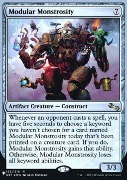 Whenever an opponent casts a spell, you have five seconds to choose a keyword you haven't chosen for a card named Modular Monstrosity today that's been printed on a creature card. If you do, this creature gains that ability. Otherwise, this creature loses all keyword abilities.