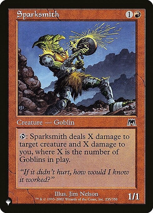 {T}: This creature deals X damage to target creature and X damage to you, where X is the number of Goblins on the battlefield.