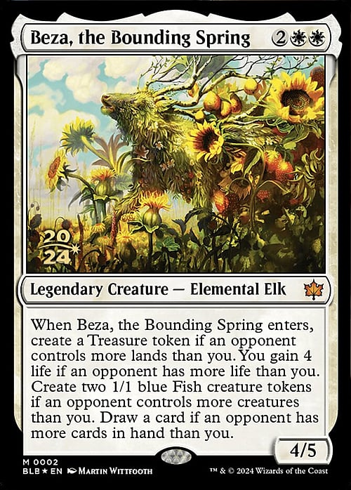 When Beza enters, create a Treasure token if an opponent controls more lands than you. You gain 4 life if an opponent has more life than you. Create two 1/1 blue Fish creature tokens if an opponent controls more creatures than you. Draw a card if an opponent has more cards in hand than you.