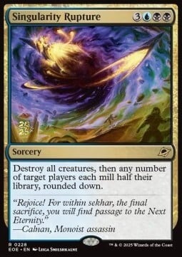 Destroy all creatures, then any number of target players each mill half their library, rounded down.