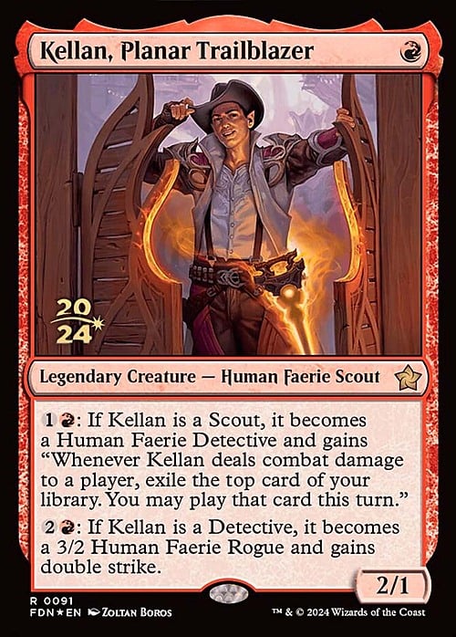 {1}{R}: If Kellan is a Scout, it becomes a Human Faerie Detective and gains "Whenever Kellan deals combat damage to a player, exile the top card of your library. You may play that card this turn."
