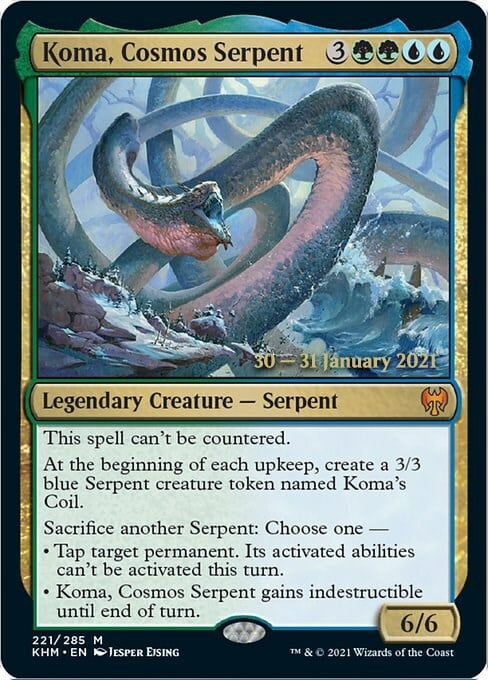 At the beginning of each upkeep, create a 3/3 blue Serpent creature token named Koma's Coil.
