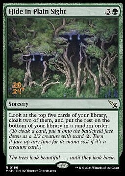 Look at the top five cards of your library, cloak two of them, and put the rest on the bottom of your library in a random order. (To cloak a card, put it onto the battlefield face down as a 2/2 creature with ward {2}. Turn it face up any time for its mana cost if it's a creature card.)