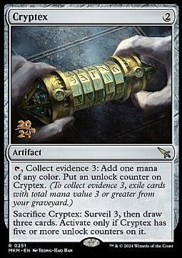 {T}, Collect evidence 3: Add one mana of any color. Put an unlock counter on this artifact. (To collect evidence 3, exile cards with total mana value 3 or greater from your graveyard.)