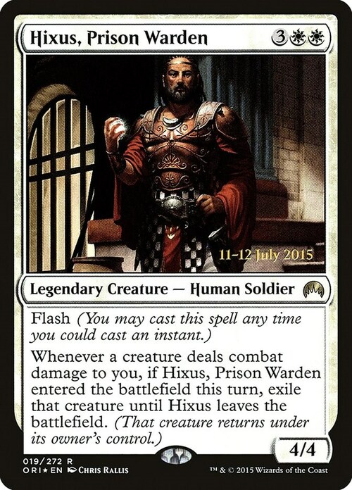 Whenever a creature deals combat damage to you, if Hixus entered this turn, exile that creature until Hixus leaves the battlefield. (That creature returns under its owner's control.)