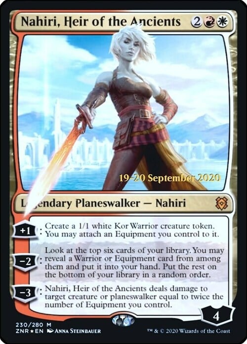 −3: Nahiri deals damage to target creature or planeswalker equal to twice the number of Equipment you control.