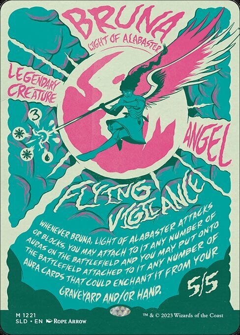 Whenever Bruna attacks or blocks, you may attach to it any number of Auras on the battlefield and you may put onto the battlefield attached to it any number of Aura cards that could enchant it from your graveyard and/or hand.