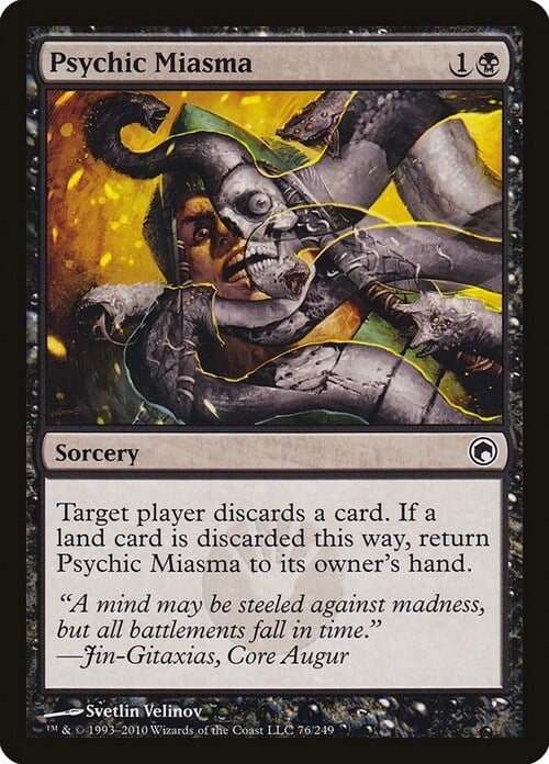 Target player discards a card. If a land card is discarded this way, return Psychic Miasma to its owner's hand.