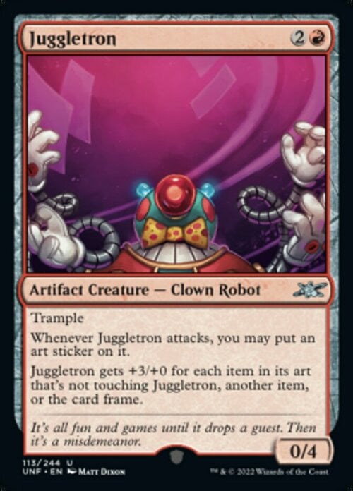 This creature gets +3/+0 for each item in its art that's not touching Juggletron, another item, or the card frame.