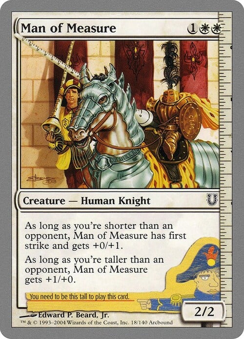As long as you're shorter than an opponent, Man of Measure gets +0/+1 and has first strike.