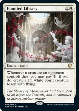 Whenever a creature an opponent controls dies, you may pay {1}. If you do, create a 1/1 white Spirit creature token with flying.