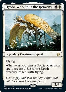 Whenever you cast a Spirit or Arcane spell, create a 3/3 white Spirit creature token with flying.
